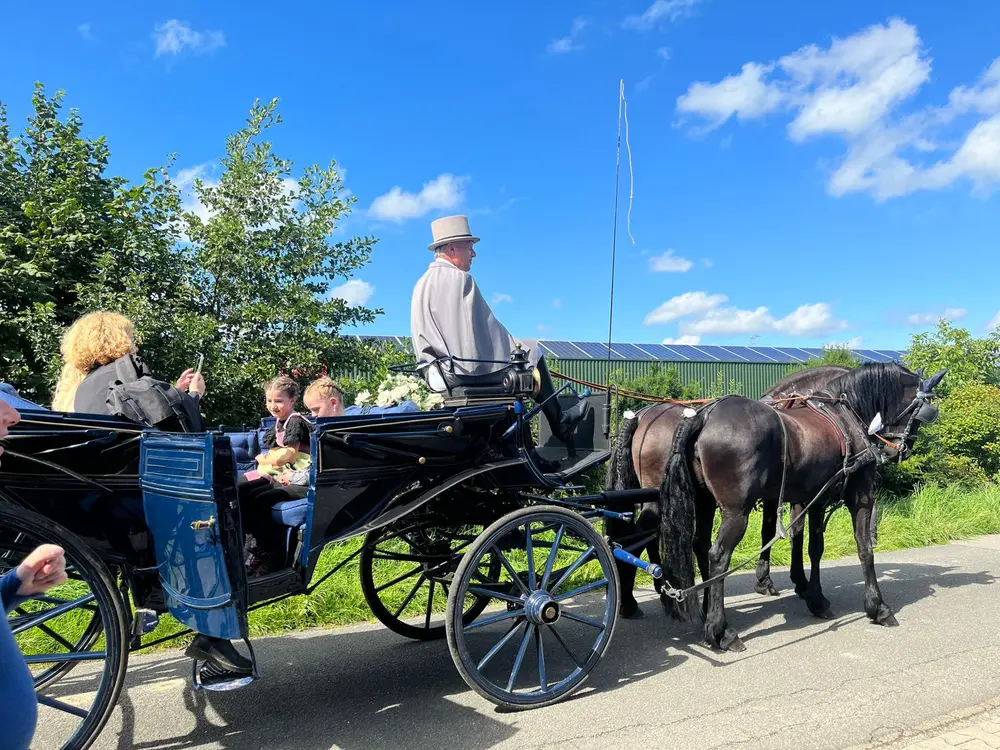 Wij brengen het bruidspaar naar de trouwlocatie of van de trouwlocatie naar de feestlocatie met een door het bruidspaar geselecteerde koets. In dit arrangement houden wij rekening met een tijdsbestek van maximaal twee uur.